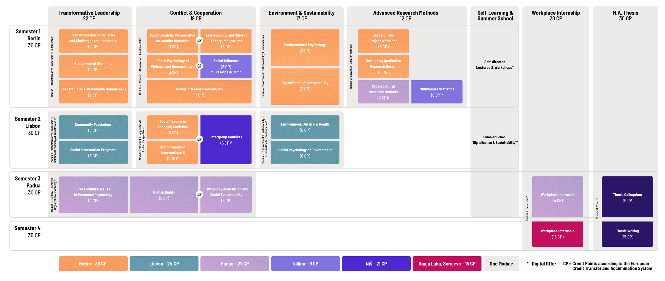 The Social Psychology of Transformation (SPOT) programme is a two-year, 120 ECTS course focusing on "Transformative Leadership," "Conflict and Cooperation," and "Environment and Sustainability." It involves mandatory study periods at IPU Berlin (Germany), ISCTE (Portugal), and the University of Padua (Italy), along with a 20 ECTS internship, preferably in Serbia or Bosnia and Herzegovina. The curriculum consists of 10 modules, including a student-organised summer school.